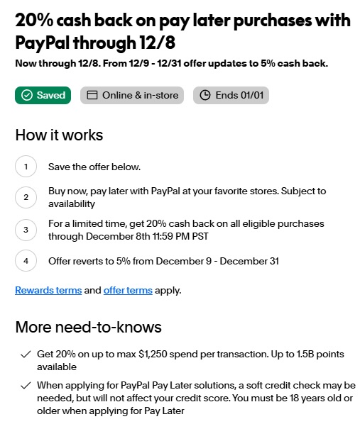 PayPal is offering some account holders 20% cashback when you use Pay in 4 (up to $1250 for a single transaction) until December 8th. This promo stacks with our street prices, since our street-price dealers accept PayPal — so if you have the offer, you can double-dip for an even better deal. Check your PayPal account to see if you’ve been targeted. Make sure you save/activate the offer.